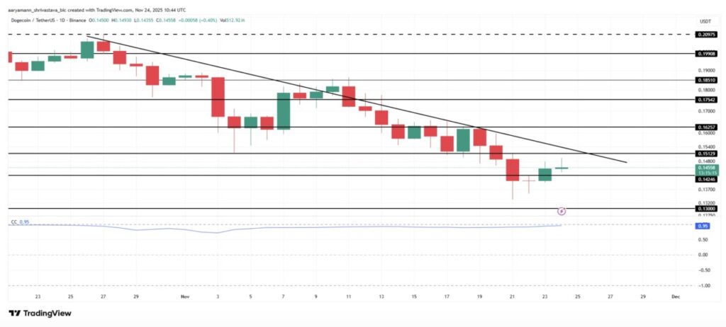However, if this ETF fails to attract enough interest, Dogecoin’s downward trend is likely to continue. A drop below the $0.142 support could drag the price to around $0.130. This kind of weakness would invalidate the bullish scenario and signal continued bearish pressure.
