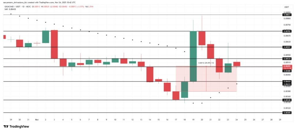 Gigachad surged 27% in the past week, showing a significant momentum shift from bearish to bullish. The Parabolic SAR indicator confirms an active uptrend, signaling increased buying interest and improving technical conditions favoring a continuation of the positive trend in the near term.