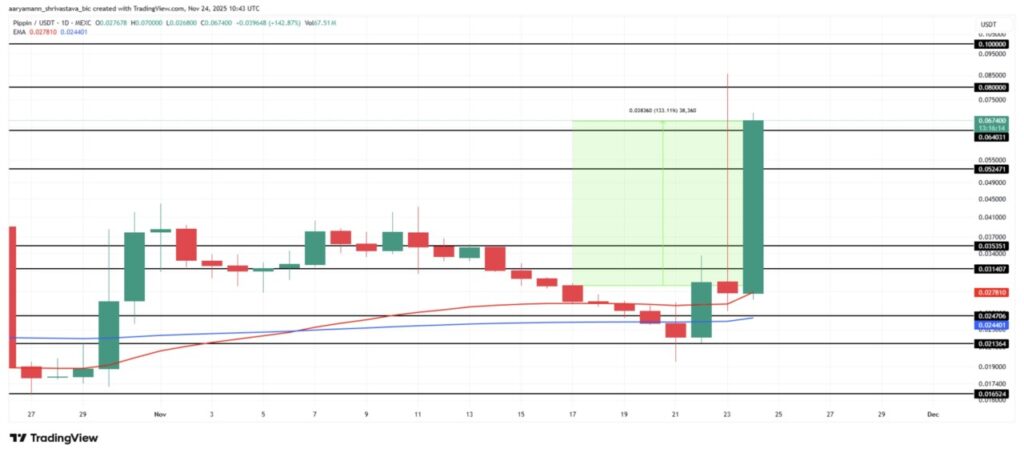 PIPPIN became the best performing meme coin this week after surging by 133% in the last seven days. On November 24, the token was trading at $0.067 and managed to turn the $0.064 level into a support area, indicating strong buying demand and renewed market attention.