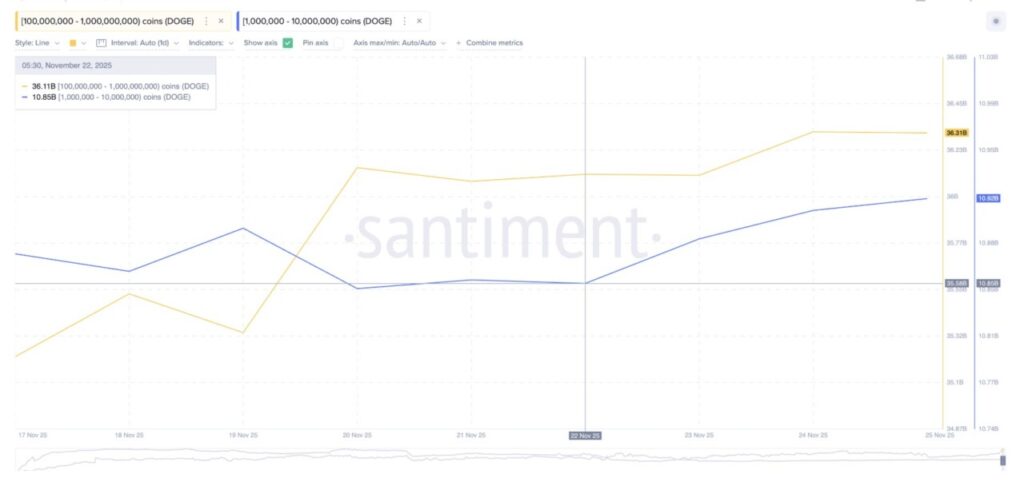 Sementara itu, kelompok kedua yang memegang antara 1 juta hingga 10 juta DOGE mulai melakukan akumulasi pada 22 November, dengan saldo naik dari 10,85 miliar menjadi 10,92 miliar DOGE.