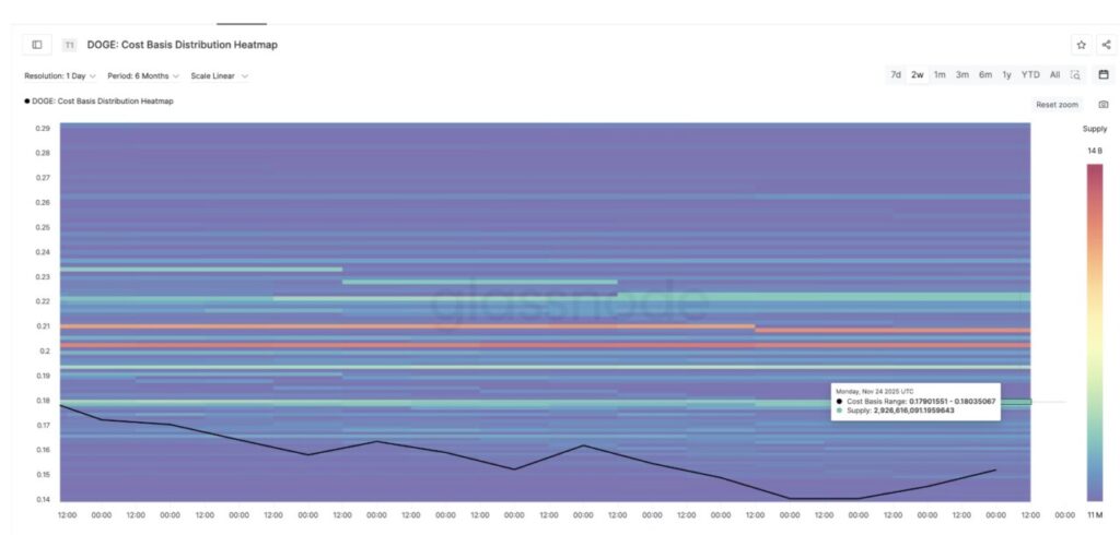 Meski didukung peluncuran ETF DOGE dan aksi akumulasi dari para whale, Dogecoin kini menghadapi blok pasokan terbesar dalam beberapa pekan terakhir. Peta panas (cost-basis heatmap) menunjukkan adanya konsentrasi padat sebesar 7,03 miliar DOGE di kisaran harga $0,17 hingga $0,18.