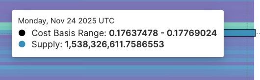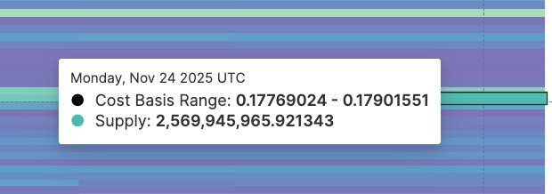 Despite a boost from the DOGE ETF and accumulation by whales, Dogecoin is now facing the biggest supply block in recent weeks. The cost basis map shows a dense cluster of 7.03 billion DOGE between $0.17 and $0.18.
