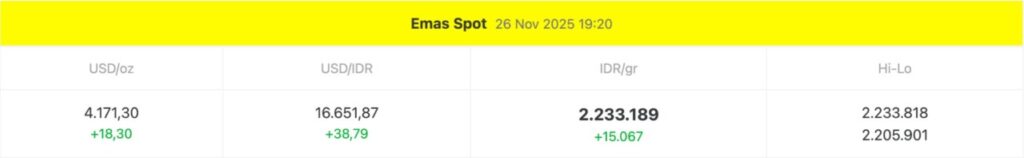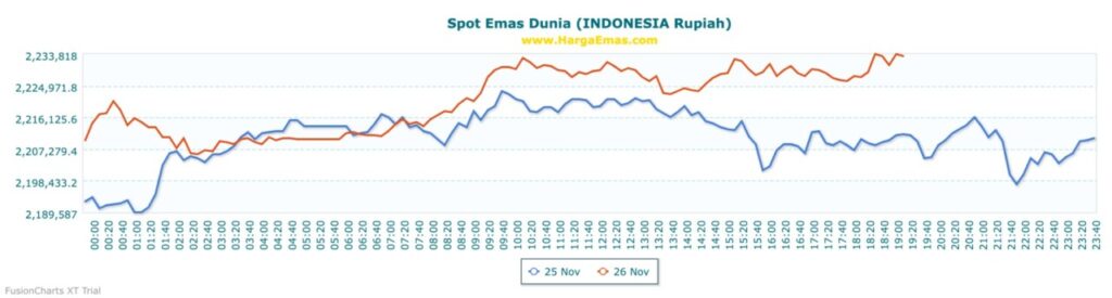 Through the daily spot gold chart (in IDR), it can be seen that the gold price on November 26 (red line) was consistently above the price on November 25 (blue line). This reflects a fairly steady upward trend throughout the day, with the highest level reached at IDR2,233,818 per gram.