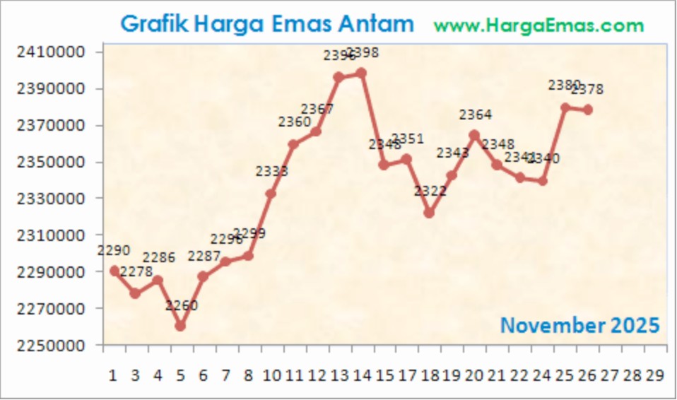 Antam’s gold price today experienced a slight correction from IDR 2,382,000 (November 25) to IDR 2,378,000. Despite the slight decline, the monthly trend in gold prices shows a strengthening.