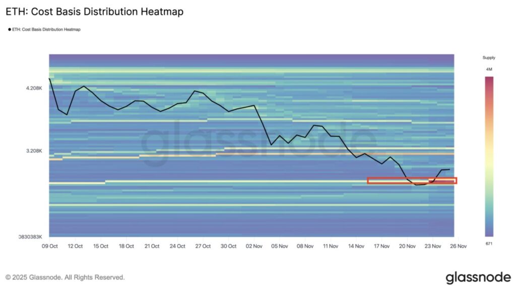 According to Ethereum’s cost basis distribution data, about 4.95 million ETH were bought by investors at an average price range between $2,800 and $2,830. The concentration of purchases at these levels creates a fairly strong potential support zone.