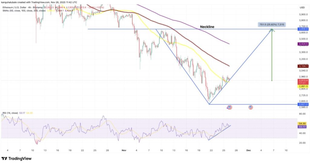 Technically, Ethereum’s price movement since early November shows the potential for the formation of a V-shaped chart pattern on the four-hour chart, as seen in the latest analysis.