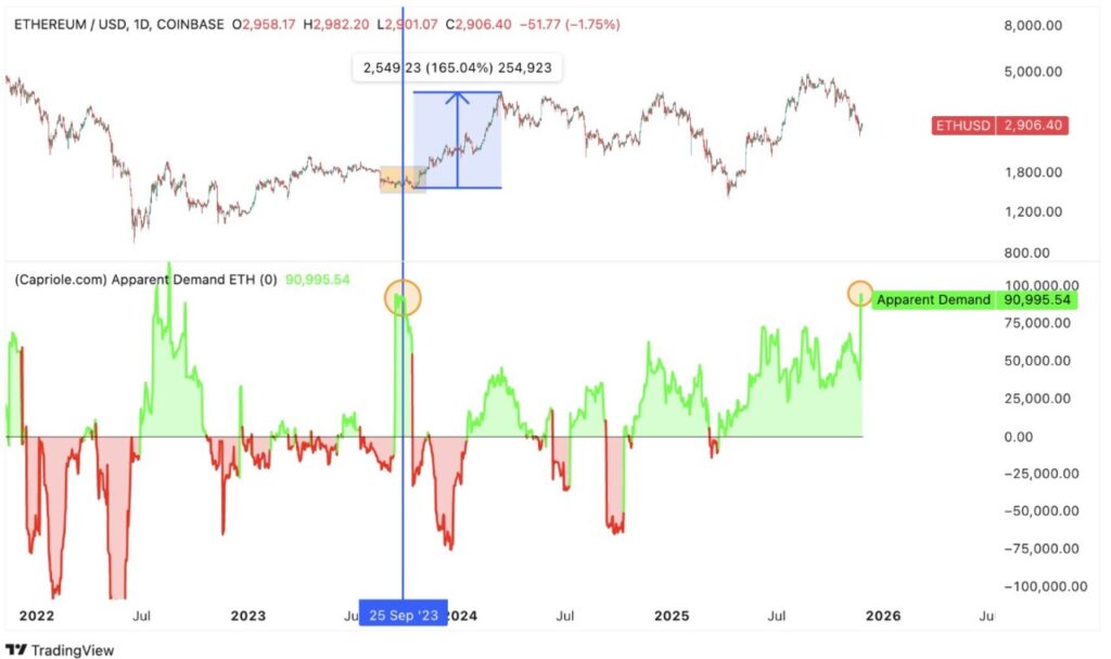 Data from Capriole Investment shows that Apparent Demand for ETH jumped sharply to 90,995 ETH on November 26, up from 37,990 ETH on November 22.