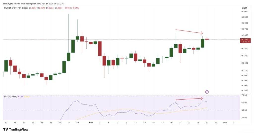 The Relative Strength Index (RSI)-an indicator that measures buying and selling strength-showed a hidden bearish divergence. Between November 20 and 26, Pi Coin’s price formed lower highs, while the RSI formed higher highs.