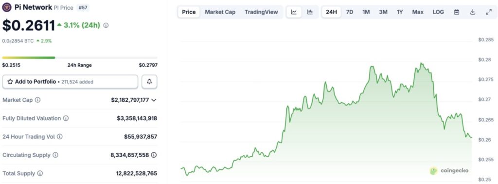 Currently, Pi Coin’s market capitalization stands at $2.79 billion, while its fully diluted valuation stands at $3.36 billion. Trading activity is also quite active, with a daily transaction volume of around $55.9 million.