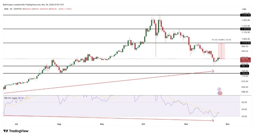 BNB is one of the few large-cap tokens that is still showing strong long-term performance. While Bitcoin is down about 6% compared to last year, and Ethereum has plummeted nearly 15%, BNB is up about 35% over the same period. This strength makes the current price drop more worthy of being called a “Black Friday discount”, rather than a sign of weakness.