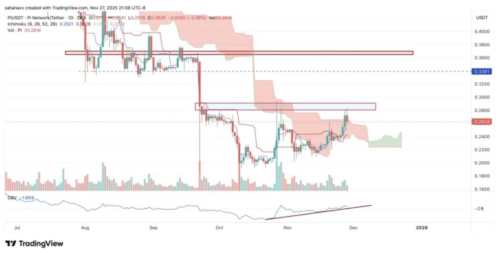 The price movement suggests that bullish investors are preparing for a bigger breakthrough. Trading sentiment has also improved significantly, with PI prices now testing the crucial $0.25 to $0.28 range – a region that has historically been both a resistance area and a short-term supply zone.