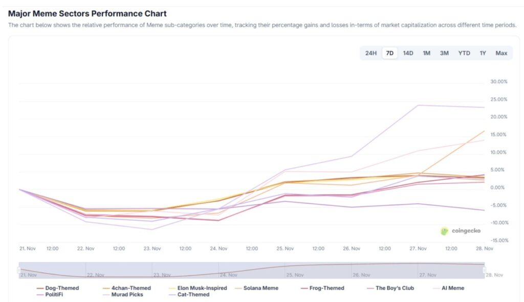 Early signals came from the recovery in average performance across the various key meme con sectors in the market. Data from Coingecko shows that most meme coin sectors recorded positive weekly returns in the last week of November.
