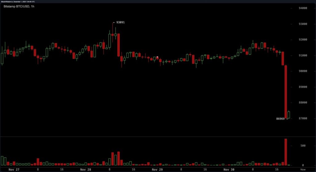 Based on a Bitcoin.com News report on Sunday evening (December 1, 2025 Indonesian time), massive selling pressure was cited as the main cause of this fall. The move also triggered the liquidation of over Rp2.3 trillion in BTC long positions.