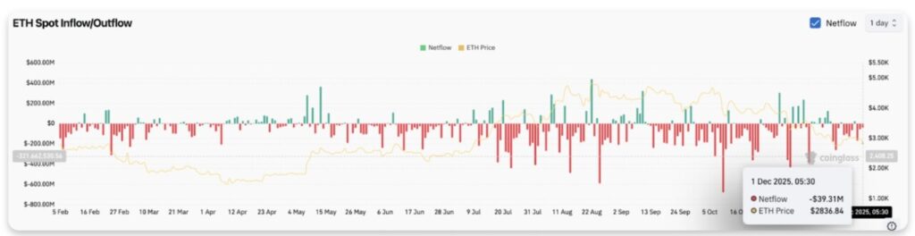 Data from Coinglass shows outflows of $39.31 million on December 1. While this amount is lighter than the massive distribution of Bitcoin , the trend reflects the consistent selling pressure in the Ethereum market throughout November.