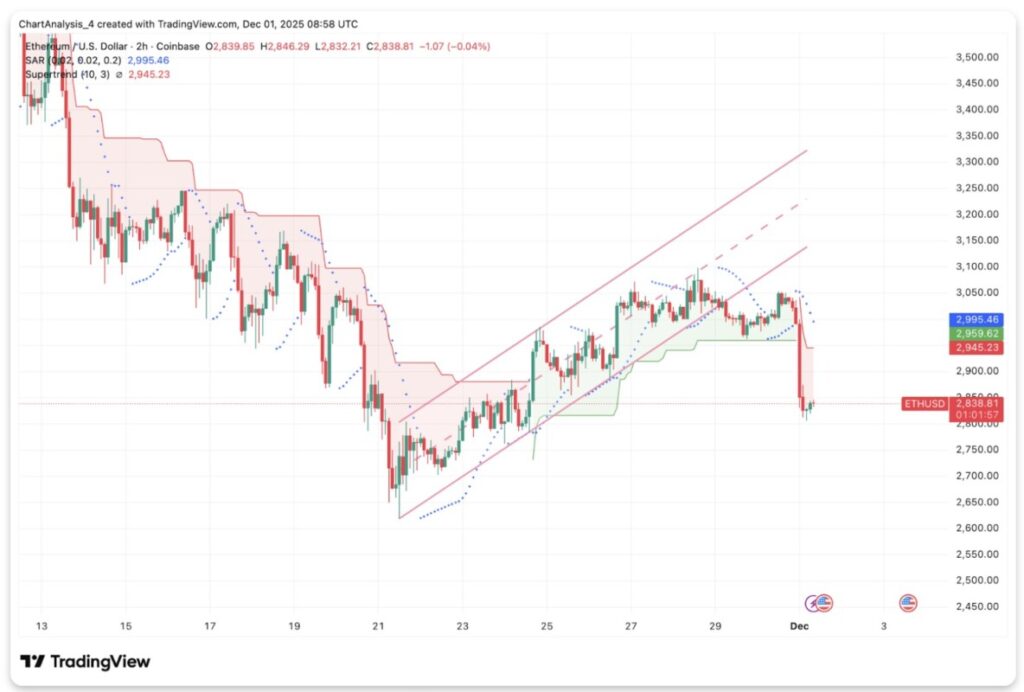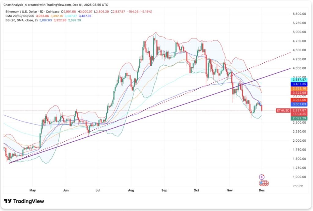Jakarta, Pintu News – Ethereum price is hovering around $2,837, down more than 5 percent on December 1 after pressure from sellers led to a strong rejection of the short-term recovery path.