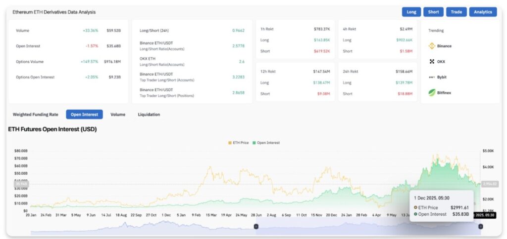Ethereum derivatives market data shows a 1.57% drop in open interest to $35.68 billion, indicating that leveraged exposure is starting to reduce. Although the movement is small, it is still significant as it comes after several days of a surge in long positions.