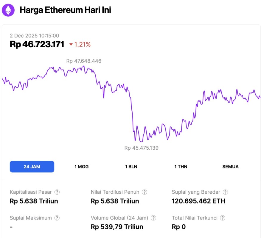 As of December 2, 2025, Ethereum was trading at approximately $2,798, or around IDR 46,723,171 — reflecting a 1.21% decline over the past 24 hours. During this period, ETH reached a low of IDR 45,475,139 and a high of IDR 47,648,446.
