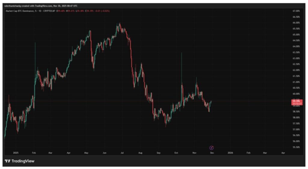 Dalam sejarahnya, musim altcoin biasanya dimulai ketika dominasi Bitcoin turun di bawah 60%. Grafik dominasi BTC sebagian besar menunjukkan tren penurunan selama bulan November.