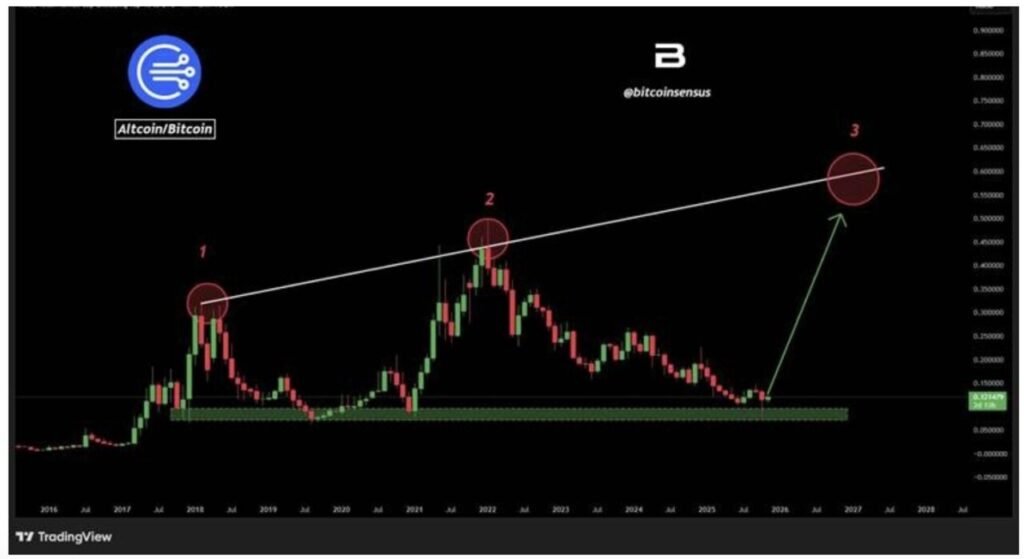 Salah satu faktor yang mendorong ekspektasi tersebut adalah grafik perbandingan altcoin terhadap Bitcoin.