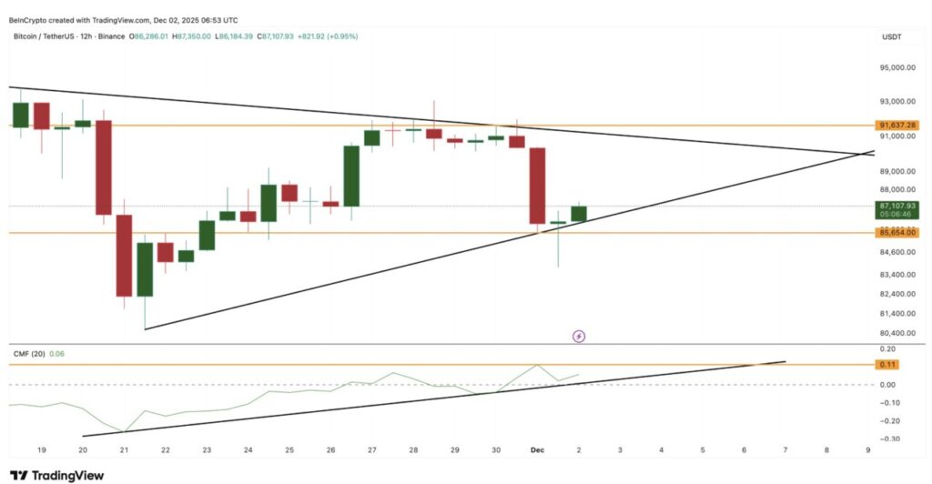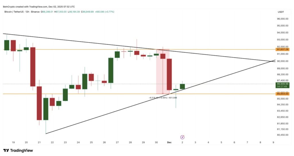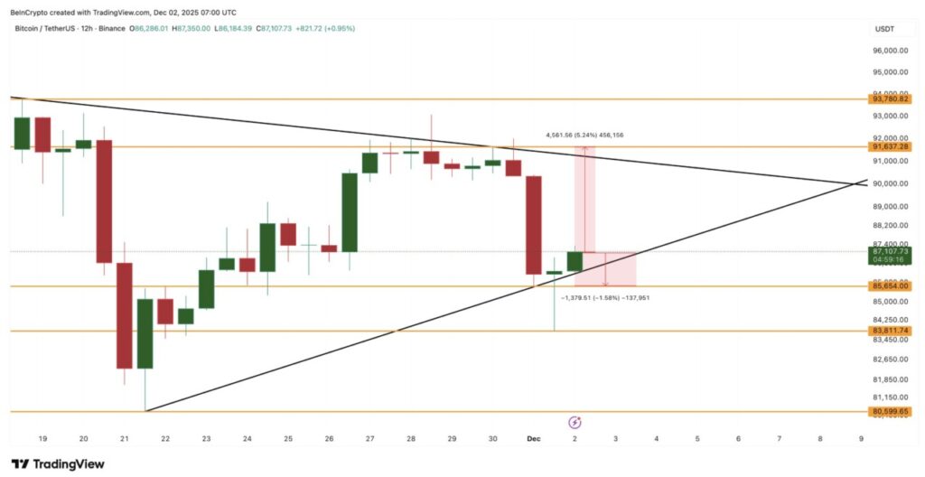 Bitcoin price is currently moving in a large triangle pattern on the 12-hour chart. The upper trendline has rejected all breakout attempts that occurred on November 28 and 30. Meanwhile, a breakdown attempt also briefly appeared on December 1, but buyers managed to lift the price back up before the candlestick closed.