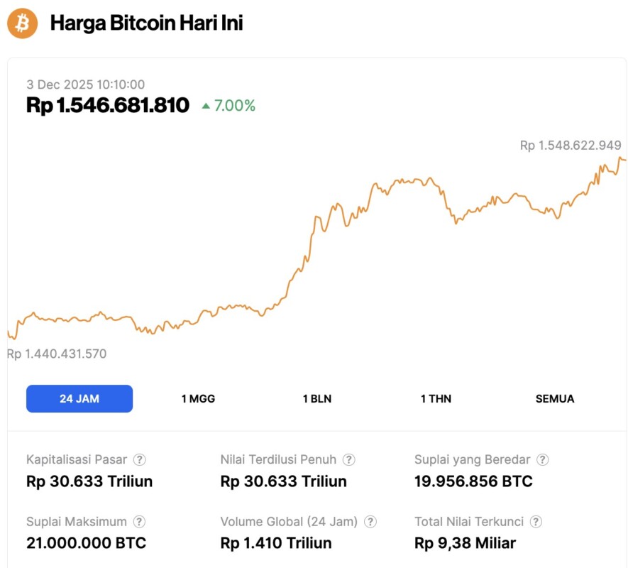 On December 3, 2025, Bitcoin was trading at $92,759, equivalent to IDR 1,546,681,810 — marking a 7.00% gain over the past 24 hours. During this time, BTC dipped to a low of IDR 1,440,431,570 and reached a high of IDR 1,548,622,949.