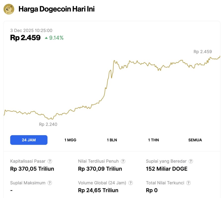 On December 3, 2025, Dogecoin saw a sharp 9.14% gain over the past 24 hours, trading at $0.1474 — approximately IDR 2,459. During this period, DOGE fluctuated between IDR 2,240 and its current peak.