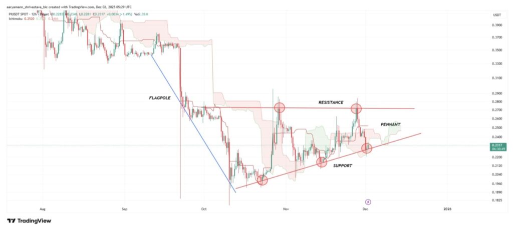 From a macro point of view, Pi Coin shows a bearish pennant pattern beginning to form. This pattern generally appears in the middle of a downtrend and indicates a continuation of bearish momentum after a brief consolidation phase.