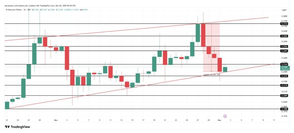 As of December 2, Pi Coin was trading at $0.232, recording a 16% drop in the last few days. Currently, the altcoin is still holding above the $0.224 support level and moving in anascending channel pattern, while testing the lower trendline as an area of support.