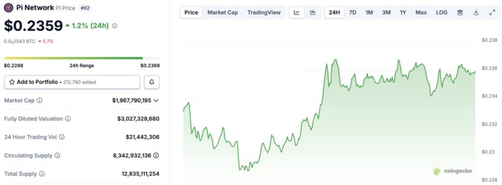 With a market capitalization of approximately $1,967,790,195 (almost $2 billion), Pi Network currently ranks 62nd on the list of crypto assets by market valuation. In addition, the trading volume in the last 24 hours was recorded at $21,442,306.