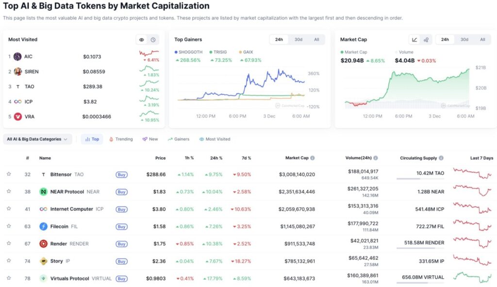 At the time of writing, data from CoinMarketCap shows that the crypto sector focused on artificial intelligence and big data is experiencing significant growth, with the total market cap reaching $20.94 billion, up 8.65% in the last 24 hours. This indicates high investor interest in crypto projects that integrate AI technology.