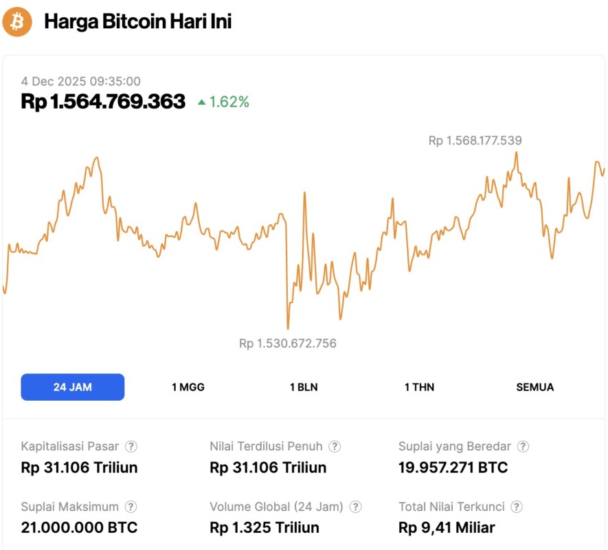 As of December 4, 2025, Bitcoin was trading at $93,735, equivalent to approximately IDR 1,564,769,363, marking a 1.62% increase over the past 24 hours. During this time, BTC hit a low of IDR 1,530,672,756 and climbed to a high of IDR 1,568,177,539.