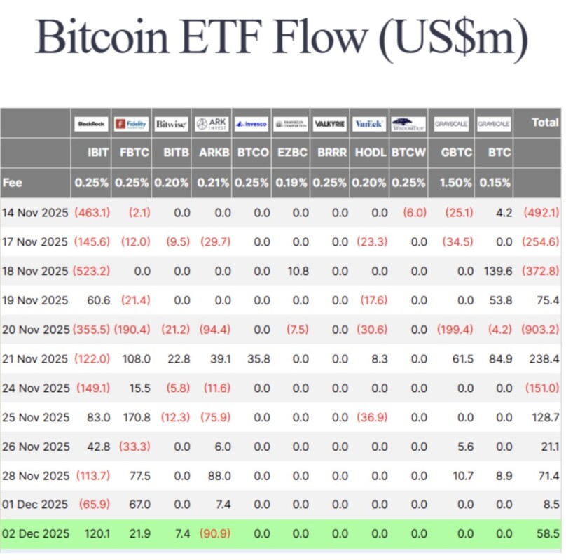According to data from Farside Investors, the US Spot Bitcoin ETF recorded inflows of $58.5 million on December 2. This was the fifth consecutive day of inflows into the asset, with BlackRock’s IBIT ETF making the largest contribution on December 2 with inflows reaching $120.1 million.