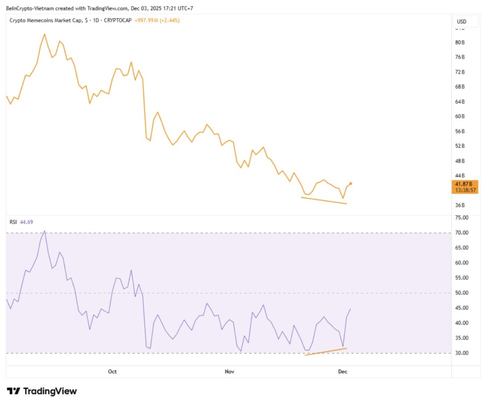 Sinyal ketiga berasal dari analisis teknikal, khususnya indikator RSI harian pada kapitalisasi pasar meme coin. Indikator RSI saat ini membentuk pola divergence bullish, di mana kapitalisasi pasar mencetak titik terendah yang lebih rendah (lower low), sementara RSI justru mencetak titik terendah yang lebih tinggi (higher low).
