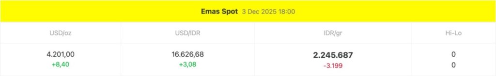 According to GoldPrice.org spot price data, gold was at $4,201 per oz or around Rp69,981,443 using a conversion of Rp16,643 per US dollar. This data shows an increase of 8.40 points which according to market reports is considered a moderate strengthening that has received global attention. This movement is back in the conversation because it is considered stable even though risk-on markets such as crypto and stocks are receiving attention.