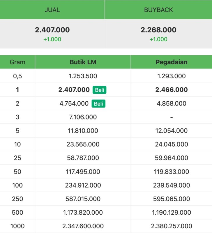 The same data also shows that the buyback price is in the range of IDR2,268,000. The difference in selling and buyback prices is an important indicator of liquidity according to gold market analyst reports. This price structure is monitored because it is often used as a reference when reading the direction of retail demand.