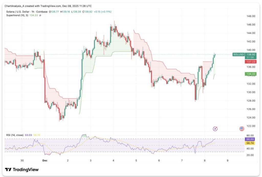 On the 1-hour chart (8/12), Solana has managed to reclaim the Supertrend flip zone at $134.33, which is now short-term support. The latest rally pushed the price to the $139 range with candles showing acceleration, and the RSI briefly touched overbought levels, indicating a momentum push, not just random movements.
