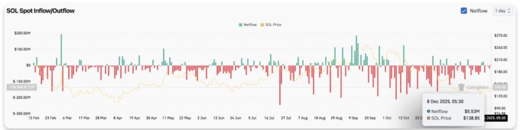 Spot flows have started to show improvement, albeit in relatively small amounts. On December 8, Solana recorded net inflows of around $5.53 million, reversing the negative trend that dominated during the previous week.