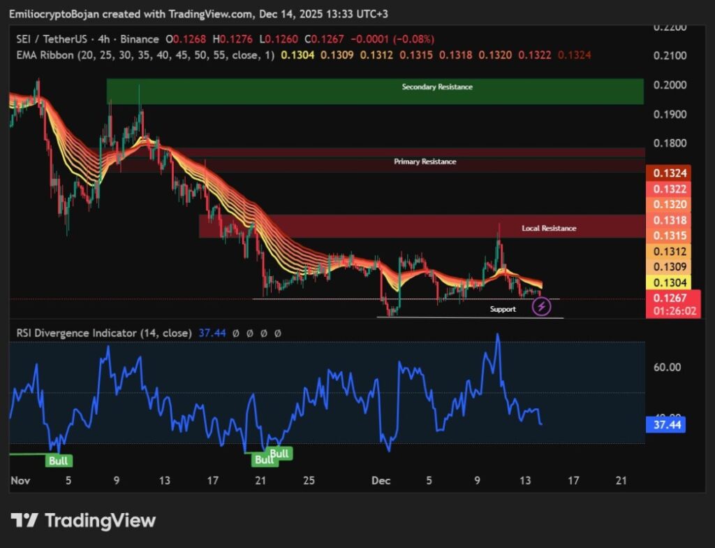 Structurally, the SEI sits between the measured downside risks and upside potential that technical analysts have mapped out. Failure to hold the $0.1216 level could potentially open room for further weakness, while success in breaking and holding above the ribbon EMA could shift the market momentum. In the event of a breakout from the current range, the $0.18-$0.20 supply zone will again be the area to monitor in evaluating the next price movement.