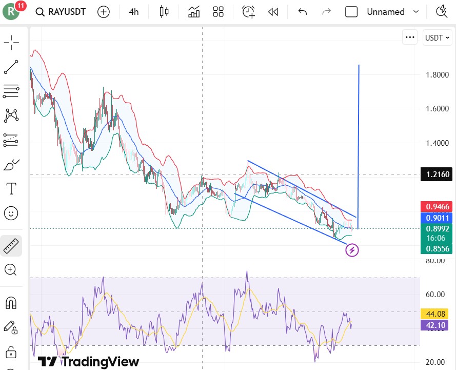 From a technical perspective, the price movement of Raydium (RAY) still shows a relatively weak market structure in the short term. Based on the medium timeframe chart analysis, the price of RAY is in a downward channel, reflecting the selling pressure that is still dominant. At a price level of around USD0.89 or equivalent to around IDR14,880 at an exchange rate of IDR16,708 per USD, the selling pressure began to slow down near the support area.
