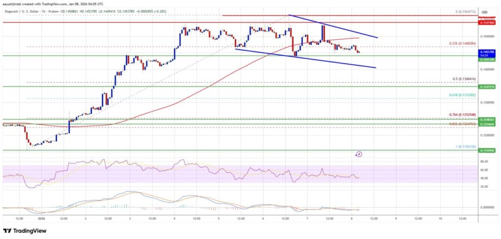 After successfully breaking above $0.1420, the price of Dogecoin (DOGE) started a significant rise. The crypto managed to cross the $0.1450 resistance, entering a positive zone that gave investors new hope. This rise continued until it reached a high of $0.1541, before finally experiencing a correction.