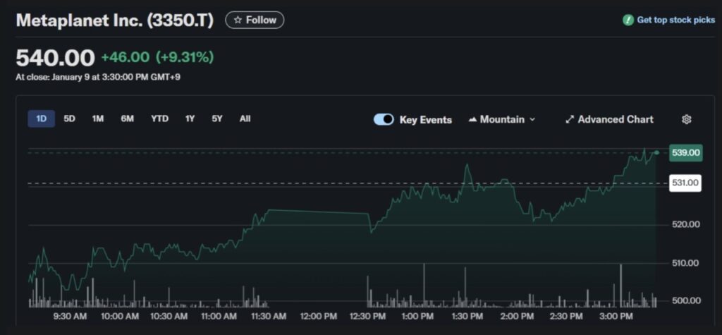 Metaplanet shares have surged again, rising more than 1.6% to $540. This marks a 46% rally so far in 2026. The company has taken the risky step of buying more than 35,000 Bitcoins and investing around $451 million in the process.