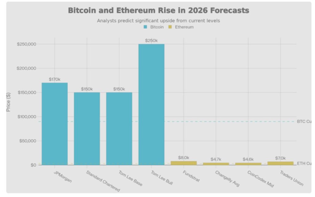 Bitcoin’s price predictions for 2026 show some uncertainty in the short term, while still reflecting strong confidence in its long-term potential. Projections from major institutions vary widely: JPMorgan expects the price to reach $170,000, Standard Chartered is targeting $150,000, and Fundstrat’s Tom Lee predicts between $150,000-$200,000 at the start of 2026, rising to $250,000 by the end of the year.