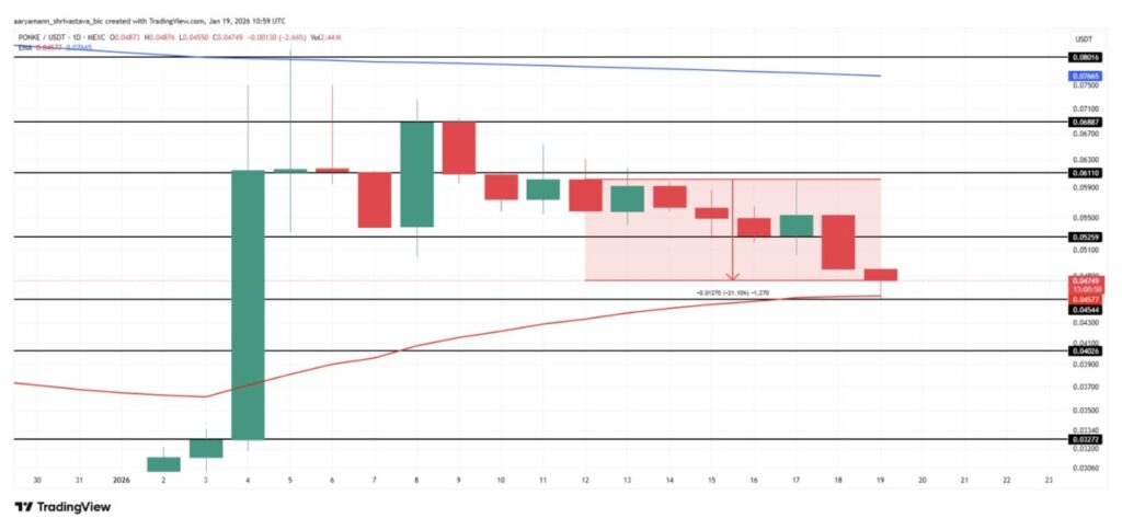 PONKE has been one of the weakest performing meme coins this week after dropping 21% and trading around $0.0474. However, the meme coin is still above the $0.0454 support level, which temporarily limits any further downside potential.