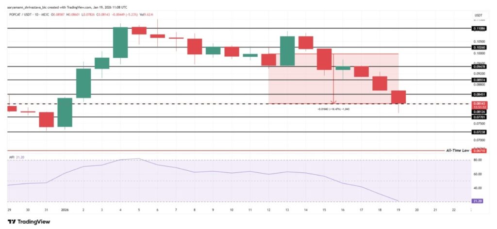 Technical indicators are showing signs of potential seller fatigue. The Money Flow Index (MFI) is hovering around 20.0 – close to the oversold area, which suggests selling pressure is starting to ease. If the MFI drops below this level, it is usually followed by a price bounce. If buyers start to step in, POPCAT could rise towards $0.089, with a target of $0.100 to recoup recent losses.