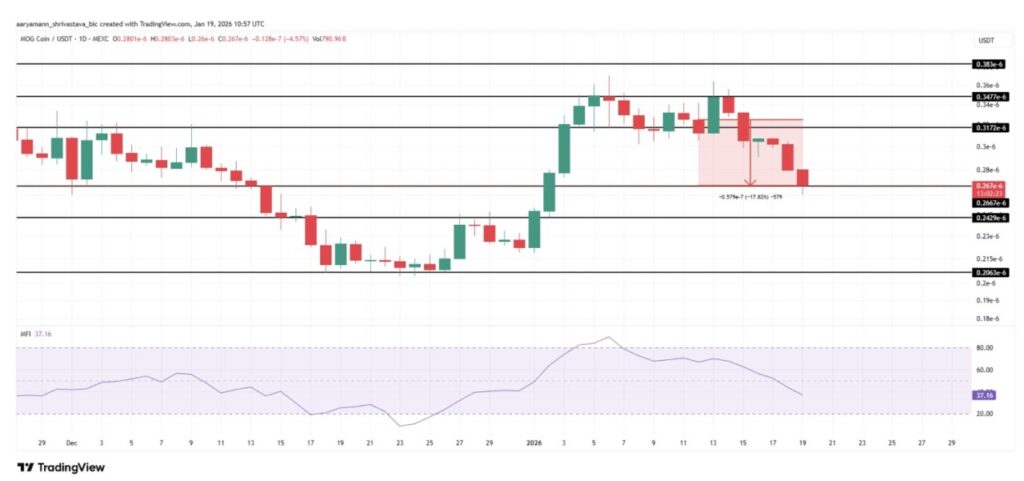 However, a change in overall market sentiment could reverse the situation. If bullish conditions strengthen, MOG may be able to hold above the $0.000000242 support. Maintaining this level could open the door for a recovery towards $0.000000317, which would invalidate the bearish scenario and signal a return of speculative interest in the coin.