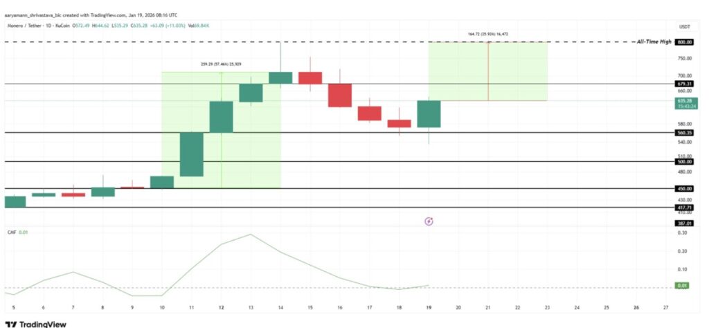 Despite the decline, XMR is still firmly holding above the $560 support zone. The Chaikin Money Flow indicator did not show any capital outflows, only a decrease in inflows on January 20. This stability indicates that accumulation may continue, opening up the opportunity for a rebound of up to 24% towards recent record highs.