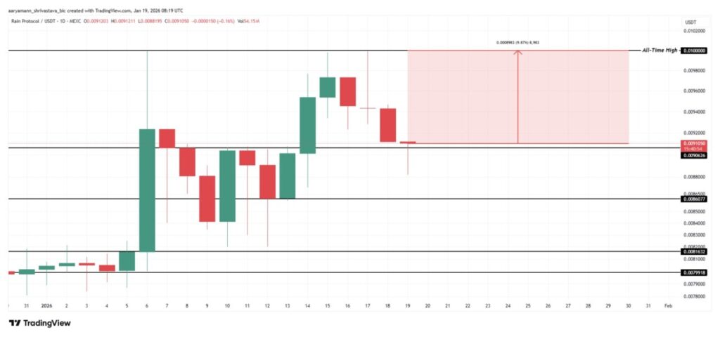 Rain is among the altcoins currently trading closest to its all-time record high. The token is less than 10% below the $0.0100 peak reached earlier this month. The strong relative performance suggests interest remains high, making RAIN an important asset to watch in the current market phase.