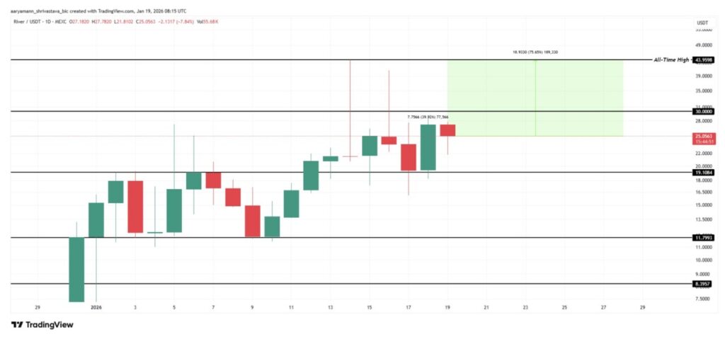 If this structure holds, bullish momentum could continue throughout the week, pushing RIVER through $30 and opening up opportunities to retest the $43 record.