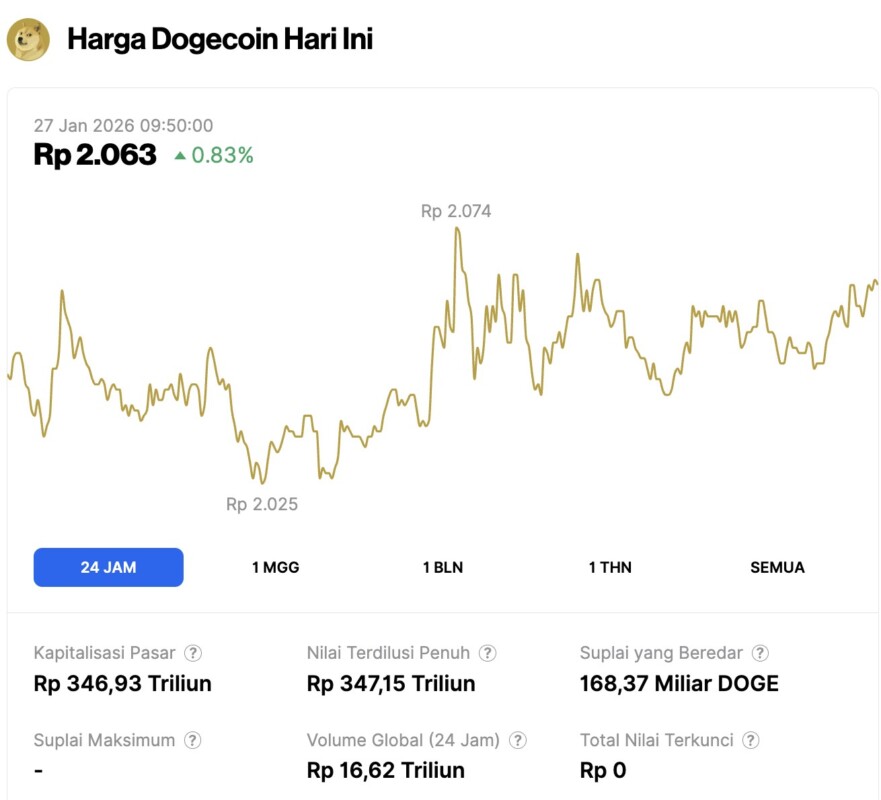 On January 27, 2026, Dogecoin saw a modest gain of 0.83% over the past 24 hours, trading at $0.1228, which is approximately IDR 2,063. During this period, DOGE fluctuated within a range of IDR 2,025 to IDR 2,074.