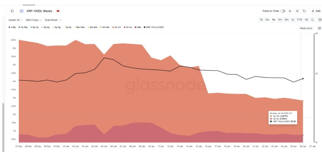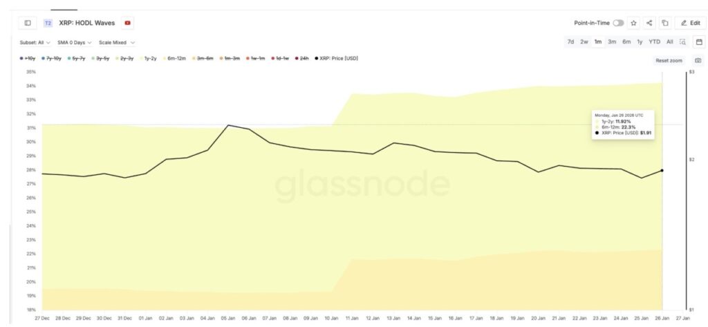 One of the most noticeable changes is seen in XRP’s HODL Waves metric. This metric shows how long the coins are held for, helping to differentiate between short-term traders and long-term holders with high conviction.